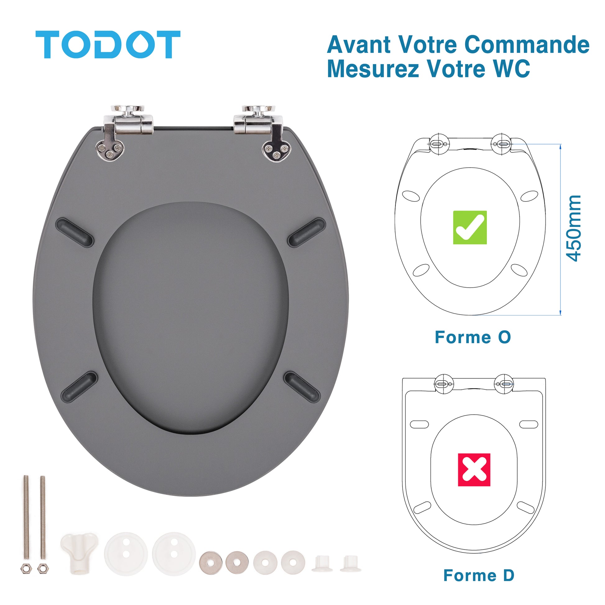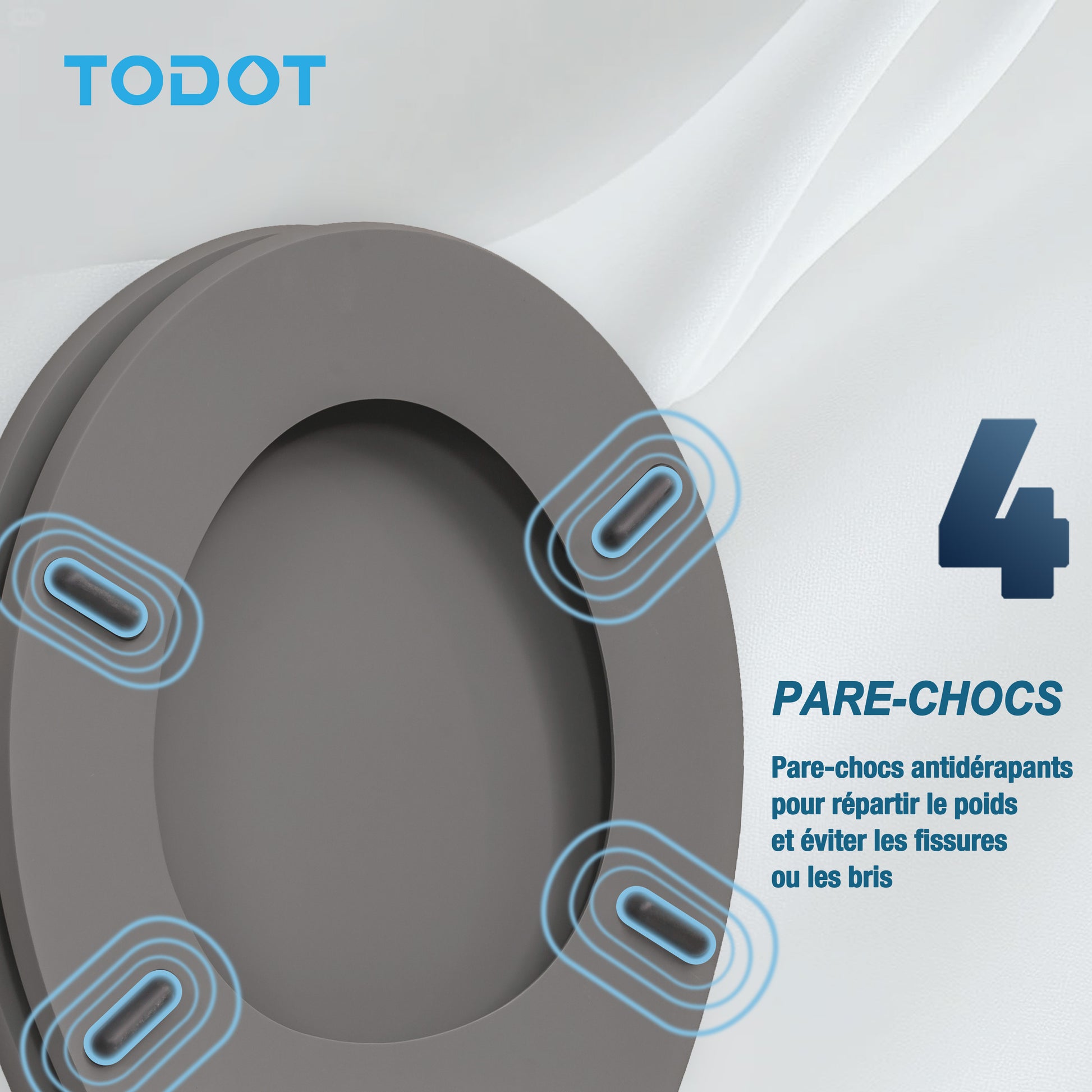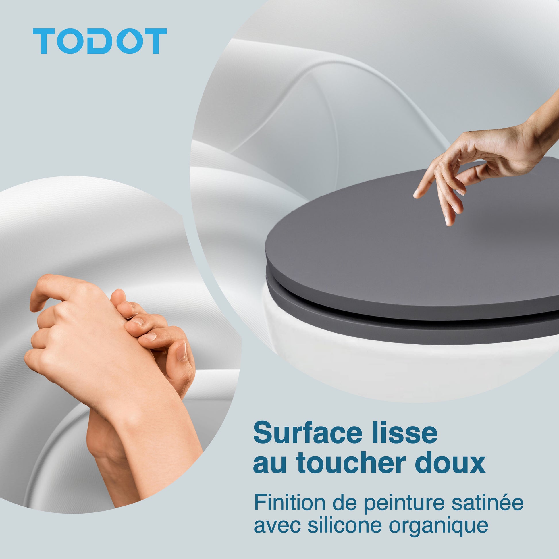 TODOT Abattant WC avec Frein de Chute Silencieux, Lunette de Toilette en Bois MDF, Revêtement Caoutchouc Doux au Toucher, Charnières Ajustables, Compatible Cuvette O, Capacité jusqu'à 175 kg (Gris)