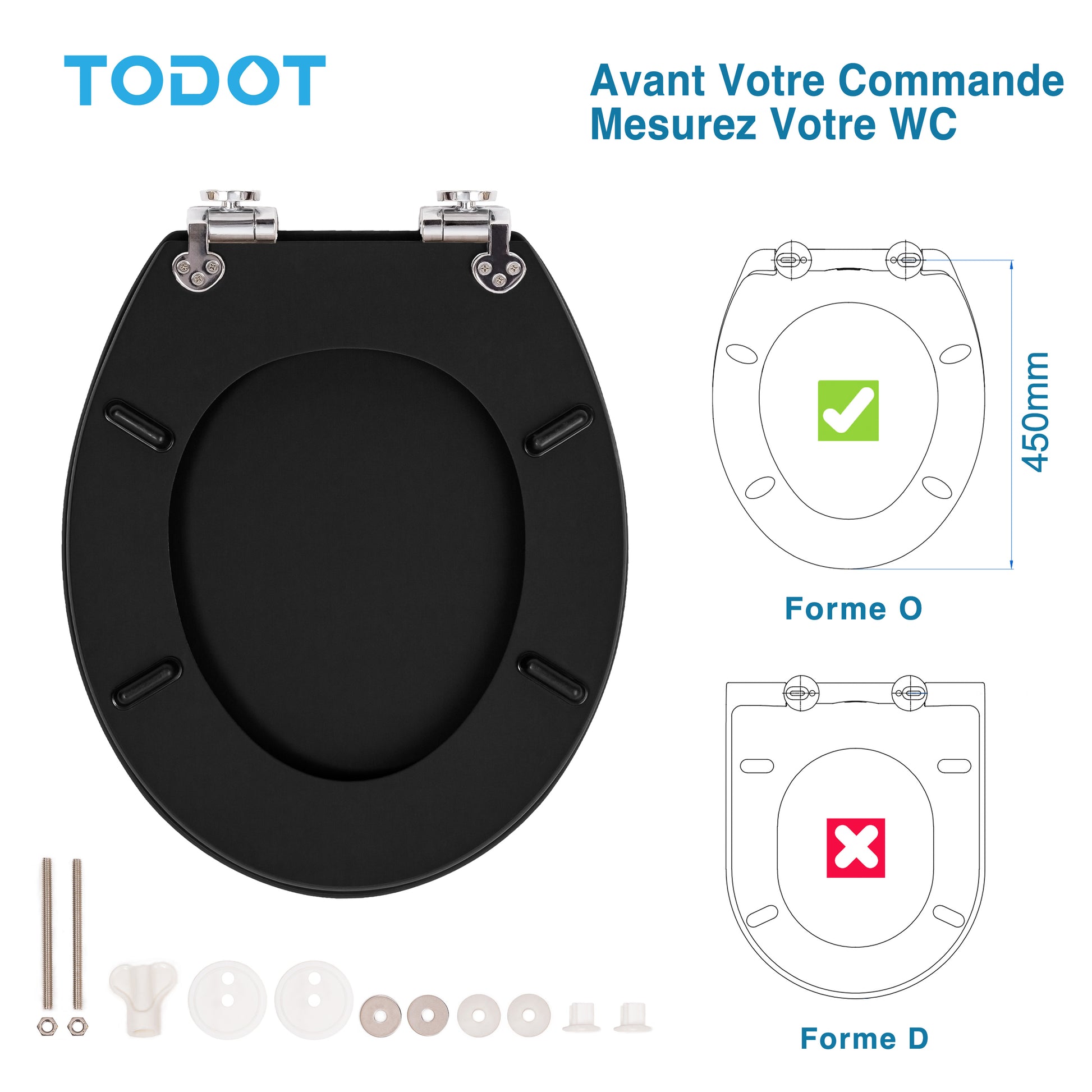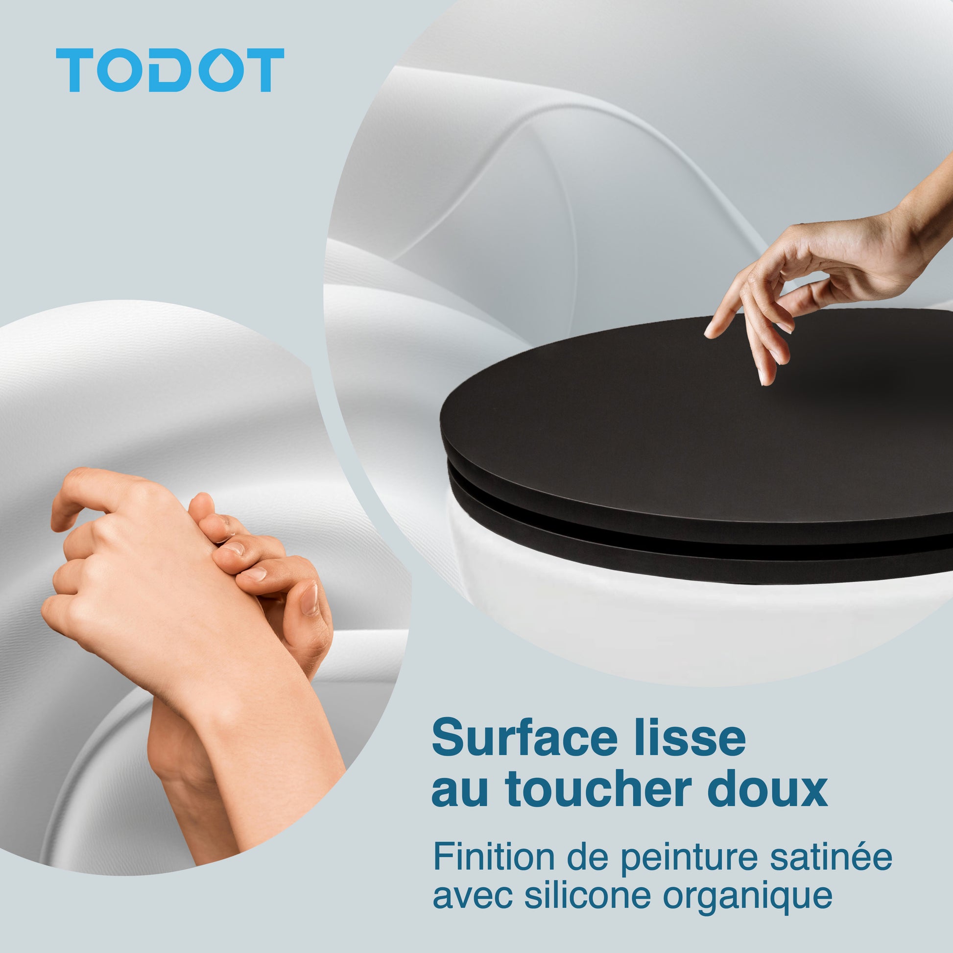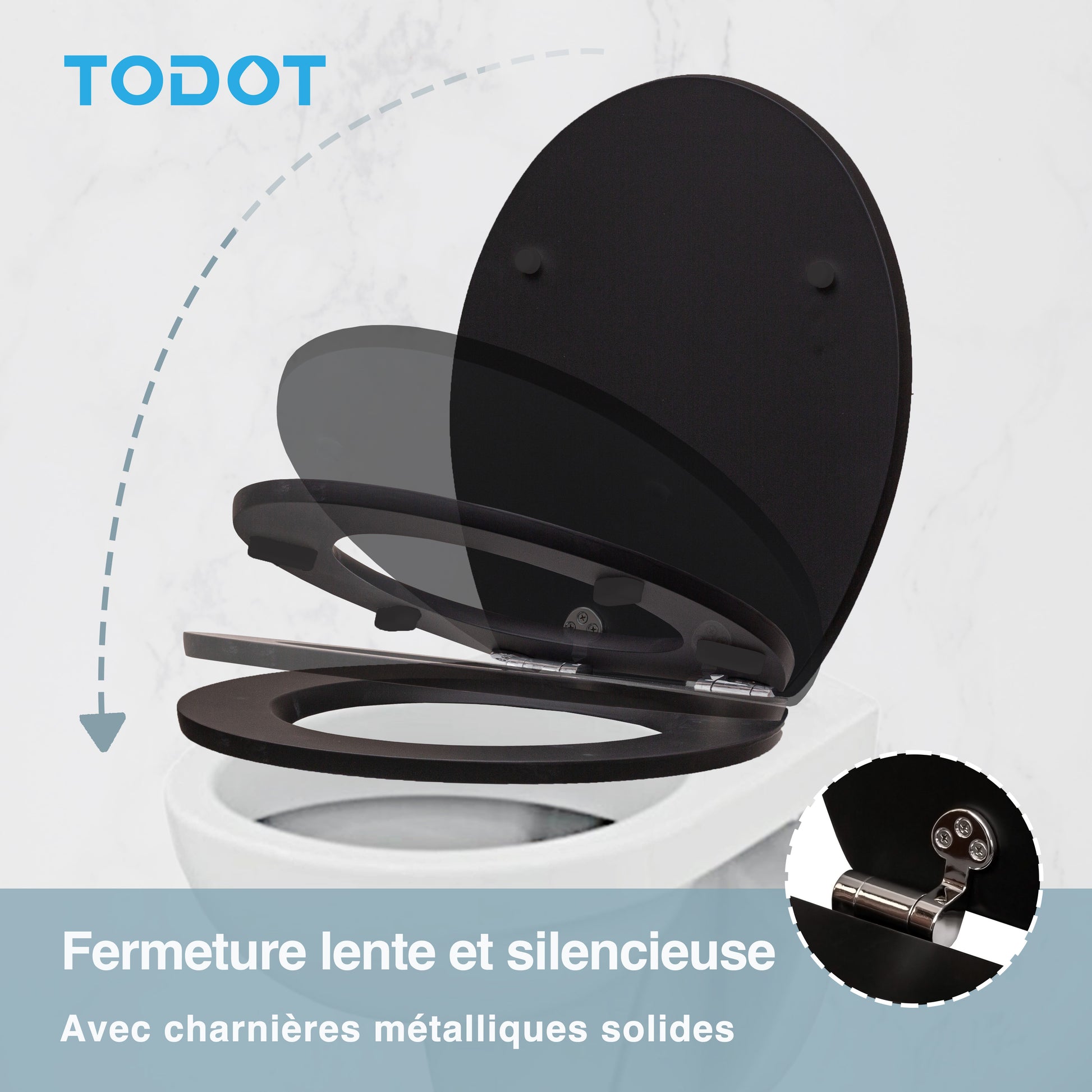 TODOT Abattant WC avec Frein de Chute Silencieux, Lunette de Toilette en Bois MDF, Revêtement Caoutchouc Doux au Toucher, Charnières Ajustables, Compatible Cuvette O, Capacité jusqu'à 175 kg (Noir)