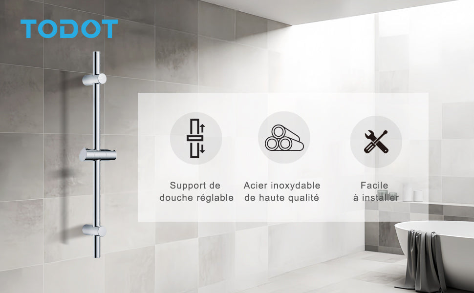 - 【Haute qualité】: La barre de douche mesure 70 cm de long et est fabriquée en acier inoxydable avec une finition chromée brillante, ce qui lui confère une résistance aux rayures et une facilité de nettoyage. Avec un diamètre de 22 mm, son design simple mais classique s'adapte parfaitement aux petits espaces et aux installations d'angle.